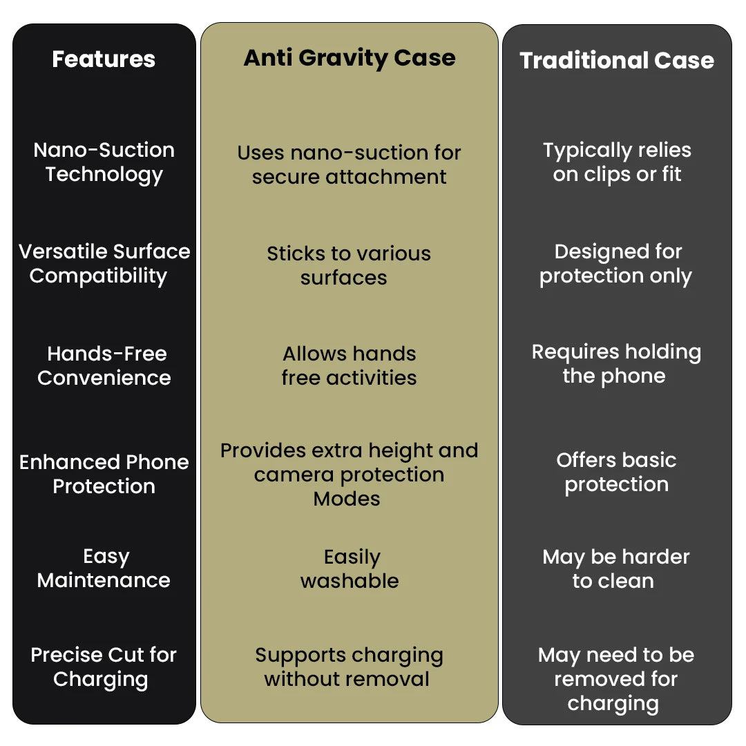 Experience true freedom with the Anti Gravity Case. Say goodbye to the limitations of holding your phone and hello to hands-free convenience. Stick it to any smooth surface, and enjoy taking stunning selfies, making video calls, or filming without the need for bulky tripods or selfie sticks.